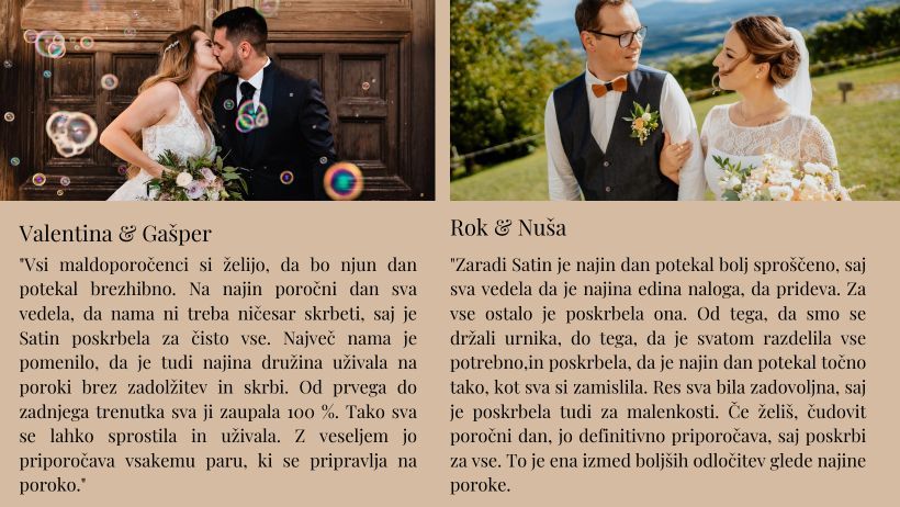 Sem Satin Papež. Na pot načrtovanja porok me je pripeljala želja po organizaciji lepih, romantičnih dogodkov. Pri vsaki taki zgodbi so moja osnovna vodila pristnost, kreativnost in empatičnost.