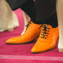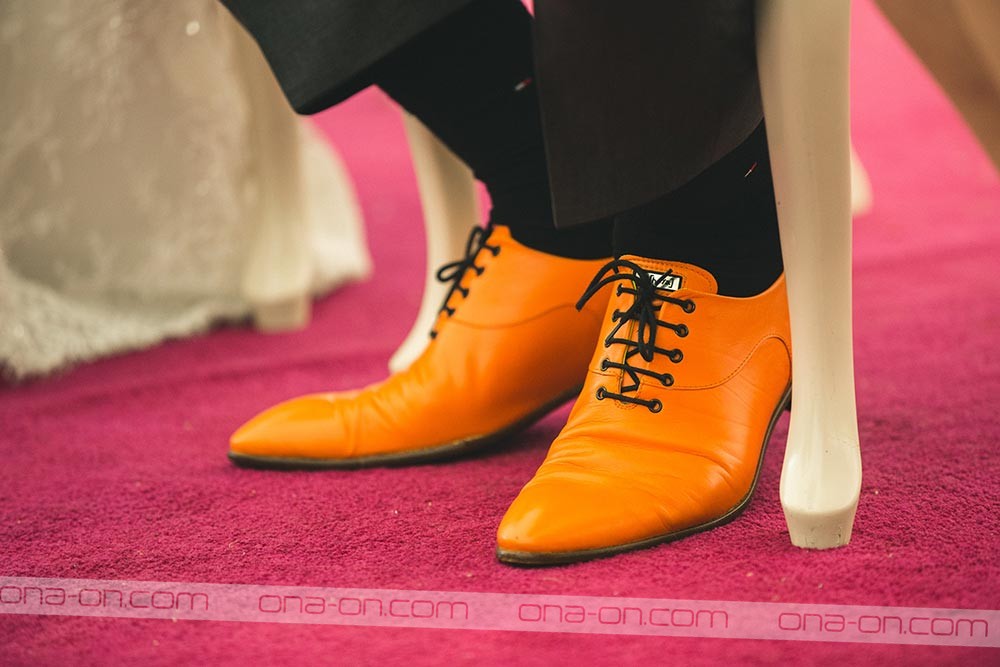 Svate je prvi pozdravil ženin Brane, ki je naravnost sijal v sivi poročni obleki, ki so mu jo po meri izdelali krojači iz Morro Sartoriale. Posebnost ženinove oprave pa so zagotovo bili oranžni čevlji, ki so mu jih po njegovih željah izdelali v čevljarstvu Mihoya.