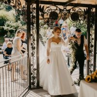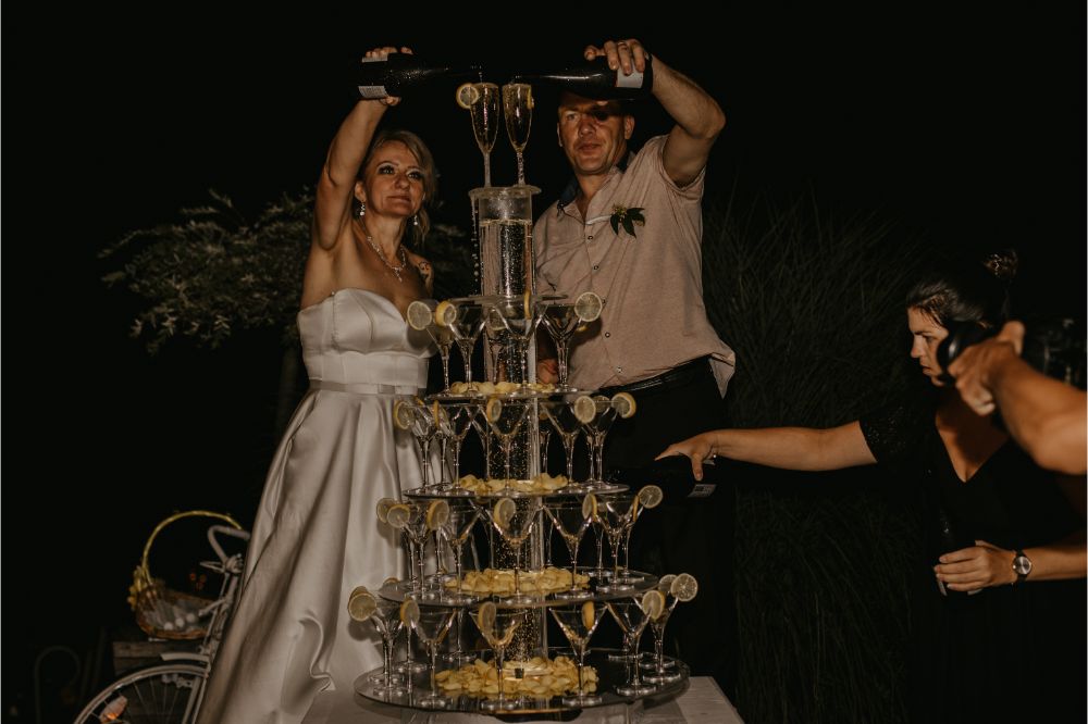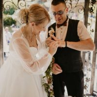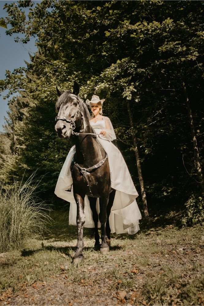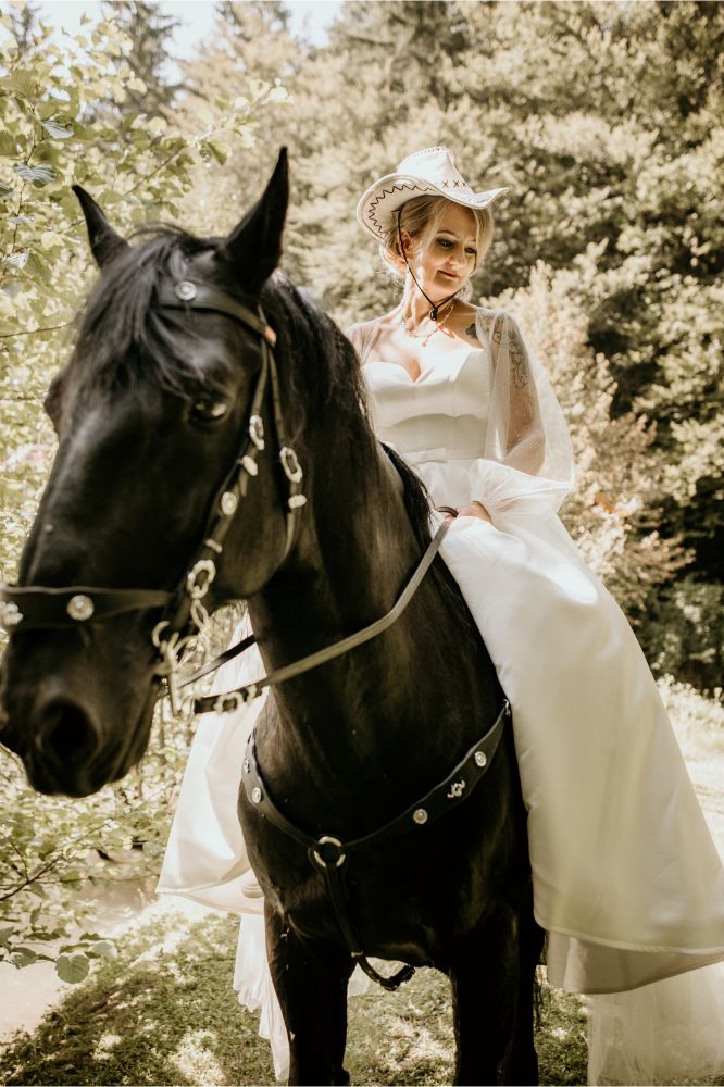 Svoj pečat na poroki so pustile tudi podrobnosti, ki sta si jih zaželela na svoj na nevesta in ženin: sladice, romantična dekoracija, poseben ambient ob prvem plesu, gin-tonic kotiček in seveda vrhunec presenečenja za ženina, ko je takrat še bodoča nevesta do oltarja kar prijezdila na konju.