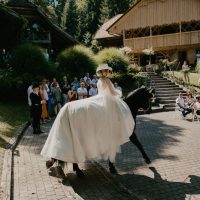 Obred se je pričel, otroci so nosili prstane in trosili rožice. Iz hiške ob jezeru je stopila nevesta – iz te smeri svatje neveste niso pričakovali. Bila je kot prava princesa. Prišla je nepričakovano in na veliko presenečenje ženina in ostalih svatov je prijezdila na konju. Ženin in vsi svatje so bili navdušeni.