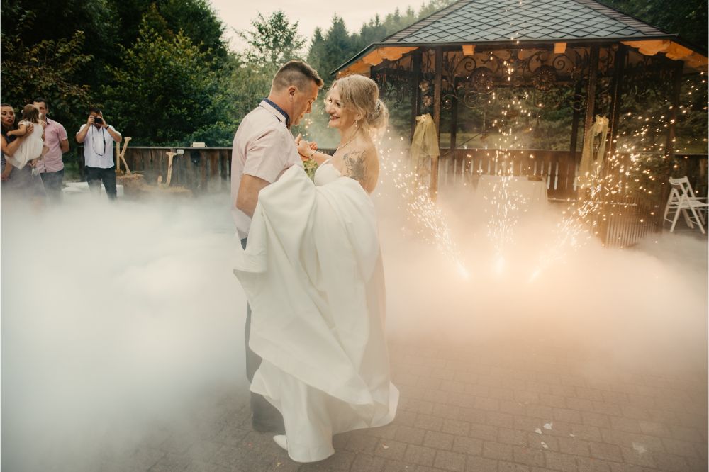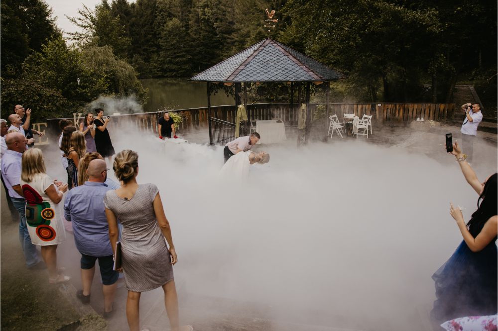Romantični vrhunec sta mladoporočenca uprizorila po prvi predjedi. Na pomolu ob jezeru sta zaplesala prvi poročni ples. Bilo je magično. Dvigala se je romantična meglica, iskrice pa so pričarale piko na i.