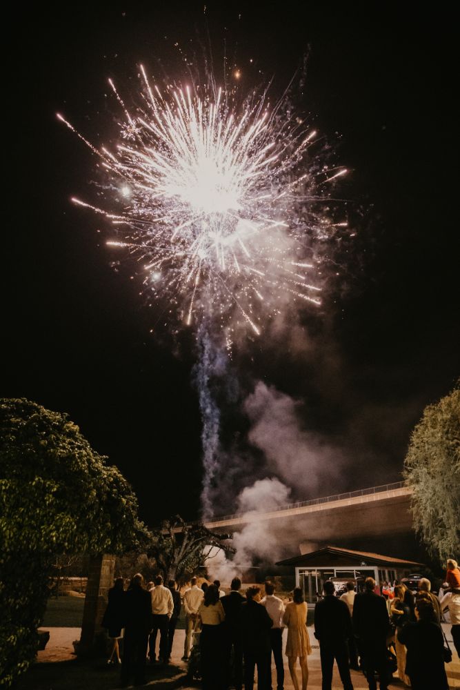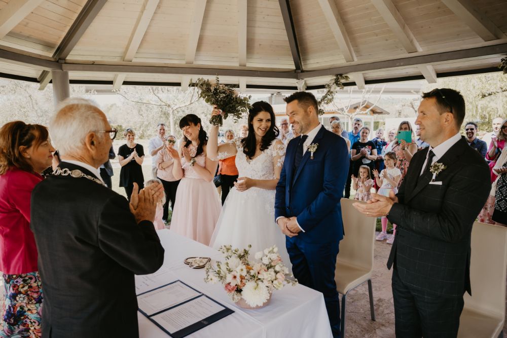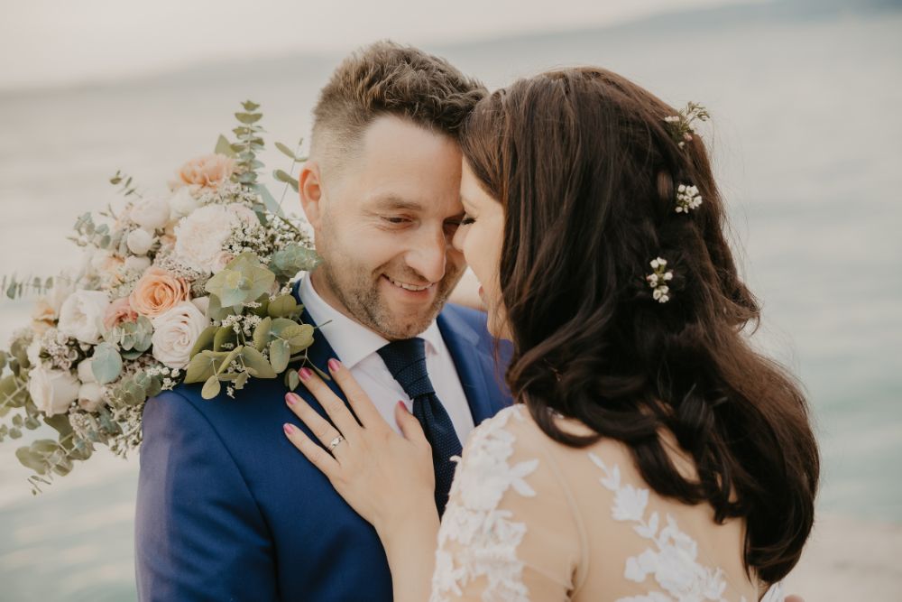 Za nevesto in ženinom je čudovit poročni dan v idiličnem primorskem okolju, ki sta ga oplemenitila s penino, pisanim sadjem in helijevimi srčki. Za veličastni zaključek prelepega dne pa je poskrbel čudovit ognjemet, ki je razsvetlil primorsko nebo. Marinki in Damjanu želimo ogromno čudovitih zaljubljenih dni!